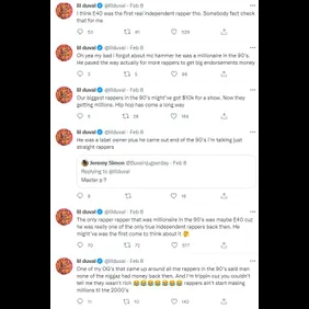 "We gotta salute more people like e40 for black history month," Duval tweeted. "Just for the fact that he thought about being independent 30 years ago. Because blacks just fully understanding now so for him to already know that back then is genius." He also speculated that E-40 may have been the only true millionaire rapper in the 1990s as an independent artist. People argued while bringing up Rap-A-Lot and No Limit.