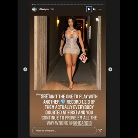Cardi's husband, Migos rapper Offset, congratulated her on the magnificent feat, saying, "She ain't the one to play with, another diamond record, 1, 2, 3 of them actually, everybody doubted at first and you continue to prove em all the way wrong @iamcardib."