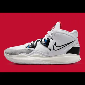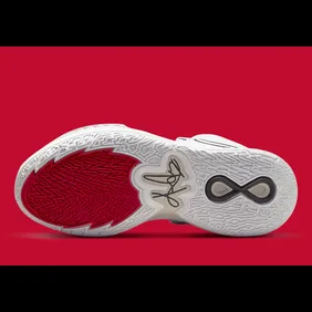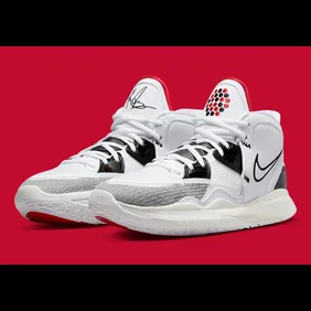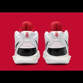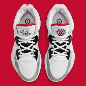 As you can see, this sneaker has a mostly white upper, all while little highlights of black are placed throughout. Overall, it is a very simple colorway that also features Kyrie's signature on the right tongue, and a circular red and black graphic on the left. It's not exactly eye-popping, however, it is clean enough for hoopers to wear either on the indoor or outdoor courts.