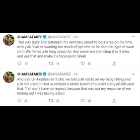 "And y’all LHH editors ain’t sh*t. we told y’all not to air my baby falling and y’all still used it," he tweeted. "Had us reshoot a whole bunch of bullsh*t and y’all still used that. Y’all don’t have no respect, because that was not my response of me finding out I was having a boy!" He continued, "That was tacky and tasteless!! It’s definitely about to be a wrap on my time with y’all. Y’all be wanting too much of ppl time to be doin dat type of wack sh*t!! We filmed a hr long convo for that scene and y’all chop it to 3 mins and use that and make it a focal point. Weak."