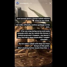 "Just turned down a Kanye collab request twice in one week," said Azealia on Instagram. "He's like officially useless garbage on his own," she said of the artist, who has recently been working with The Game, Antonio Brown, MoneyBagg Yo, and others. "If he can stop being corny and make amends with Jay for watch the throne 2 (which prob won't happen, Jay doesn't play that dirty dope head sh*t) I *might* consider... But Id rather collab with Doja Cat than Kanye at this point. She's making better music than him."