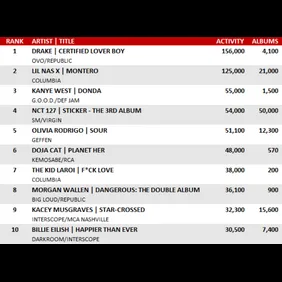According to the report, Drake will be at #1 for a third straight week after notching 156,000 equivalent album sales through streaming, moving just over 4,100 units through pure sales. In comparison, Lil Nas X is set to move 125,000 equivalent album units for MONTERO, with 21,000 of those coming through pure sales. The third-place spot, of course, belongs to Kanye West with DONDA, which is on pace to sell 55,000 additional units this week, with 1,500 pure sales.