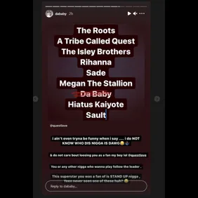 The Roots icon Questlove also spoke out against DaBaby's remarks in a social media post. "I was hypothetically asked if I was curating an updated version of #SummerOfSoul who would be my acts?" the musician penned in a post. He listed his group, Rihanna, A Tribe Called Quest, Megan Thee Stallion, Sade, The Isley Brothers, Haitus Kaiyote, Sault, and DaBaby. However, this time around, he scratched the rapper's name out. "I gave my dream list."