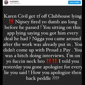 "Karen Civil get tf off Clubhouse lying," wrote Trotter on Instagram. "Nipsey fired yo dumb ass long before he passed! You sitting on this app lying saying you got him every deal he had? N***a you came around after the work was already put in. You didn't come up with Proud 2 Pay. You was a bitch doing interviews. I'm on yo fuccin neck bro!!!!"