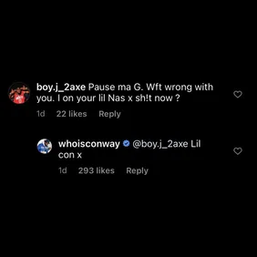 The rapper's core fanbase compared his fashion decision to an episode of The Boondocks, coming after him in the comments. When one fan asked him if he was "on his Lil Nas X shit" now, Conway came back with a funny response.