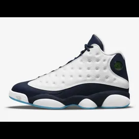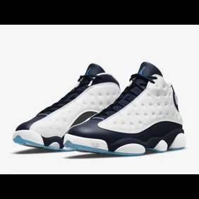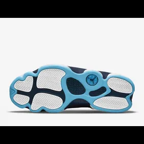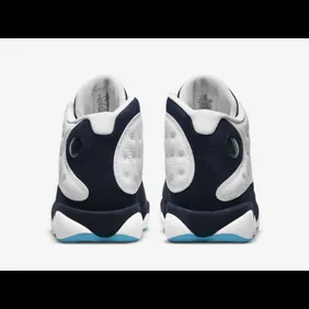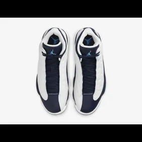 The latest Air Jordan 13 to be shown off is the "White/Dark Powder Blue" model, otherwise known as Obsidian. In the photos below, you can see how the sneaker has a mostly white leather upper that engulfs each side, as well as the midsole. From there, navy blue is placed all the way down the tongue and the sides in a way that gives this shoe a streamlined look to it. Finally, powder blue highlights are found on the outsole and Jumpman logo, to give a UNC vibe.