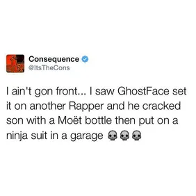 Ghostface w/ bottle of Moet v. Action Bronson would be a truly great fight. Who you got?
