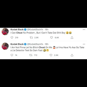 "I Can Cheat No Problem , But I Can’t Take Dat Sh*t Boy [weary face emoji][crying laughing emoji]," the rapper tweeted. "I Am Not Finna Let No B*tch Cheat On Me[X cross-armed emoji] Lol Ima Have Yo Ass Go Take a Lie Detector Test So Dam Fast [sideways crying laughing emoji][smoke blowing out of the nose emoji]."