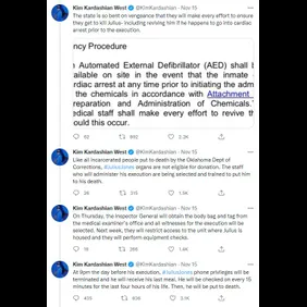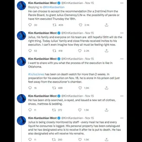 Kim Kardashian has shared a lengthy, detailed explanation of Jones's case on social media as she petitions Oklahoma Governor Kevin Stitt to halt the execution. "I want to give u all an update on Julius Jones. We are all anxiously awaiting a decision from Governor Stitt," she tweeted.