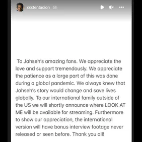 Meanwhile, XXXTentacion's estate dropped off a message on his Instagram Story: "To Jahseh's amazing fans. We appreciate the love and support tremendously. We appreciate the patience as a large part of [the documentary] was done during a global pandemic. We always knew that Jahseh's story would change and save lives globally."