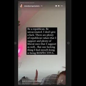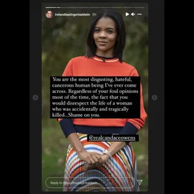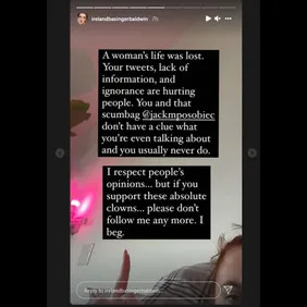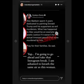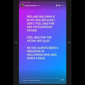 The actor's daughter, Ireland Baldwin, took to social media to defend her father against those who have accused him of being a murderer, including Owens. The model posted a photo of Owens to her Instagram Story and wrote, "You are the most disgusting, hateful, cancerous human being I've ever come across. Regardless of your foul opinions most of the time, the fact that you would disrespect the life of a woman who was accidentally and tragically killed...Shame on you."