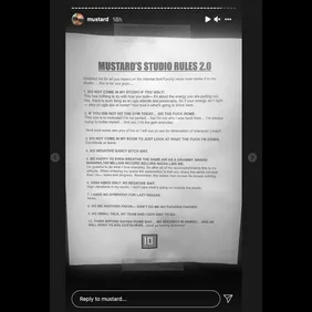 Uploading a photo of "Mustard's Studio Rules 2.0," Mustard explained that he shared the list "for all you haters on the internet that'll prolly never ever make it to my studio."