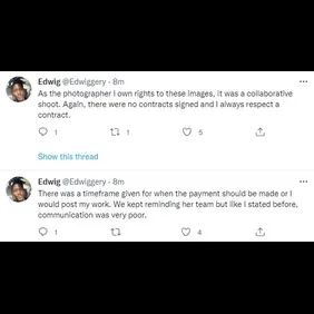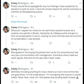 "Definitely not doing anything for clout, there’s so much more to this than you guys know, I’m not a bad person. I’m not arguing with anyone on social media. Never have, never will. And please stop sending death threats," the photographer wrote, adding that contracts were made but not signed. He also said SZA expressed interest in purchasing the pictures, "but had very poor communication with management."