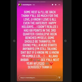 "Some rest & I'll be back," he wrote on Wednesday. "Thank y'all so much for the love, u know I love u all even the haters!!! Happy holidays... I didn't realize I had 60 points in the 3rd quarter I should've been benched myself, some should be thankful I'm giving y'all a head starts anyways (I'm still talking shit but if u know me u know I'm humble lol...) Allahu Akbar. See y'all next year #FlyGod Seriously thank u."