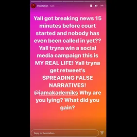 "Yall got breaking news 15 minutes before court started and nobody has even been called in yet?" Meg wrote. "Yall tryna win a social media campaign, this is my real life! Yall tryna get retweets spreading false narratives! @iamakademiks why are you lying? What did you gain?"