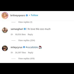 After hearing Spears sing to the top of her lungs, Miley Cyrus appeared in her comments, dubbing Spears "the vocal bible." It's a term that has been used to describe many vocalists, but it has long been Brandy's title in the industry.
