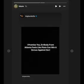 Updating his story on Instagram with a repost from Duct Tape Entertainment CEO Big Bank Black, Future appeared to co-sign the following message: "I Promise You, ErrBody From Atlanta Feels Like Pluto Can Win A Versus Against Hov!"
