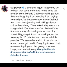 Greedo continued his thoughts in the comments section, adding, "I’m just happy you got to beat that case and come home to be too level Drakeo. Me and Dubb was talking about that and laughing from keeping from crying. He said you’ve became super sayin Drakeo! Best cars, best jewelry and talking all your sh*t while shining. They asked why we shot a song called 'Out the slums' on Rodeo Drive. It was our way of showing out on our city street. N***as get it out the mud, get on the freeway for 20 minutes and be around rich peoples. We from where a lot of trends start at and never get credit. I’m going to keep that movement going and I’m going to forever keep your name ringing."
