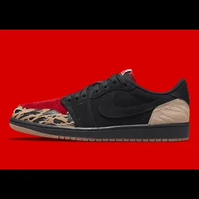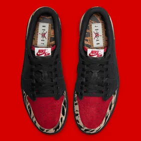 As you will see, this is definitely a wild collab as there is a lot happening here. For instance, the toe box is red, while the middle part of the shoe, including the Nike swoosh and tongue, is black. We then have some animal print embossed at the front, which has a tan and black look to it. More animal print is then found on the back, however, it is simply all tan. SoleFly logos are then placed on the back heel, for good measure.