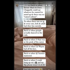 "To when there was no ig & every one, kids & adult had they fun outside," she added. "Back to when people actually danced in the club. Back to when T-Pain was at the peak of his career. Back to when Lil Wayne had all his locs. Back to when lil booties mattered. Back to when I could hang up on a [ninja emoji] and my flip phone went CLACK!"