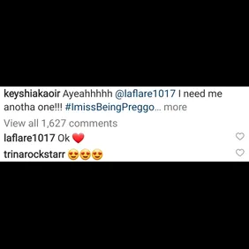 "Ayeahhhhh @laflare1017 I need me anotha one!!!" the model and CEO of Ka'Oir Fitness wrote in the post's caption. "#ImissBeingPreggo #IWas9monthsHere #BabyIce."