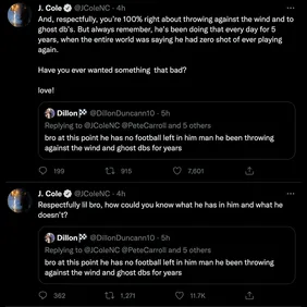"Respectfully lil bro, how could you know what he has in him and what he doesn’t?" he said. "And, respectfully, you’re 100% right about throwing against the wind and to ghost db’s. But always remember, he’s been doing that every day for 5 years, when the entire world was saying he had zero shot of ever playing again."