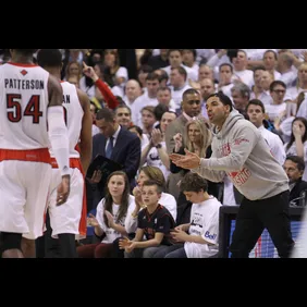 Here is Drake giving Raptors coach Dwayne Casey a heart attack.