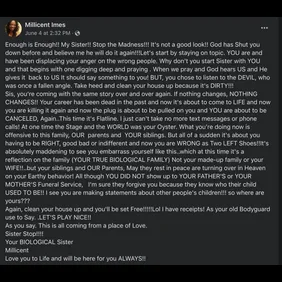 The entire debacle has caused Mo'Nique to face an onslaught of backlash from not only the public but from her sister, Millicent Imes. In a Facebook post, the comedian's kin told her to knock it off.