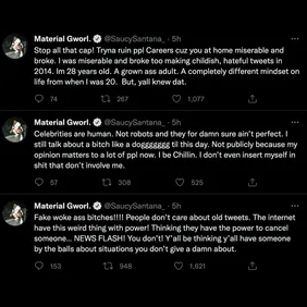 As several of his old tweets became trending topics, Santana returned to call out "fake woke" people who were "miserable" enough to dig through his past remarks. He noted that he was "broke and miserable" at the time, but he stood ten toes down on not owing the public an apology.