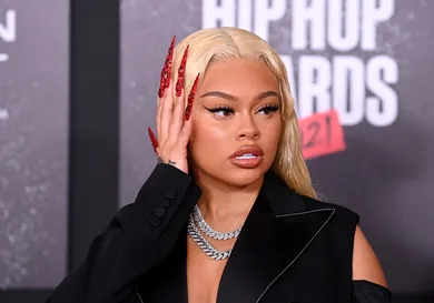 We’re loving this leather look with red accents covered in sequins. Latto’s even matching her hair to the ‘fit.