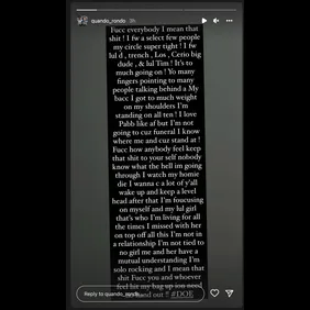 "It's time for me to spend time to myself and free myself from a lot of people," he wrote on his Instagram Story. "My Main Manz Gone & a lot more sh*t I'm cool on alot of sh*t if I feel like you not with me it's no reason for me To be holding on to you no need to shake your hand or fake some with you ! I'm Living Life How I wanna live life whatever I wanna do ima do it you gone either gone get with it or get lost."