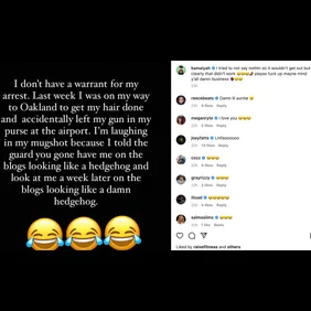 “I don’t have a warrant for my arrest," she wrote. "Last week I was on my way to get my hair done and accidentally left my gun in my purse at the airport. I’m laughing in my mugshot because I told the guard you gone have me on the blogs looking like a hedgehog and look at me a week later on the blogs looking like a damn hedgehog. [crying face emojis].”