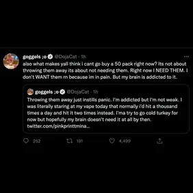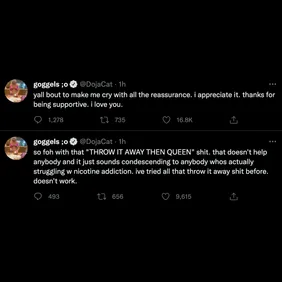 "Throwing them away just instills panic. I'm addicted but I'm not weak," she said. "I was literally staring at my vape today that normally i'd hit a thousand times a day and hit it two times instead. I'ma try to go cold turkey for now but hopefully my brain doesn't need it at all by then... so foh with that 'THROW IT AWAY THEN QUEEN' sh*t. that doesn't help anybody and it just sounds condescending to anybody whos actually struggling w nicotine addiction. ive tried all that throw it away sh*t before. doesn't work."