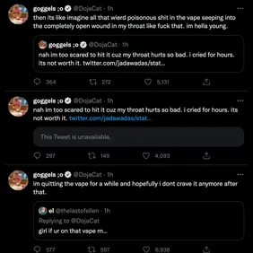 She also tweeted that she would be having her tonsils removed soon and has quit vaping. Someone told her to completely throw the vape away to solve her problems, and while the singer seems committed to bettering her health, she explained to the Twitter user why that isn't always the best choice.