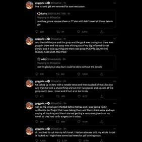 "And then i drank wine and was vaping all day long and then i started getting a nasty ass growth on my tonsil so they had to do surgery on it today," Doja added. "He poked up in dere with a needle twice and then sucked all the juice out and then he took a sharp thing and cut it in two places and squoze all the goop out in dere. i cried and it hurt a lot but im ok."