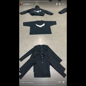 Throughout the evening, Bari took various pictures of Ye's pieces, which were strewn about on the floor. As you can see, there are baseball caps, shirts, hoodies, bodysuits, leggings, cargos, and a whole lot more.