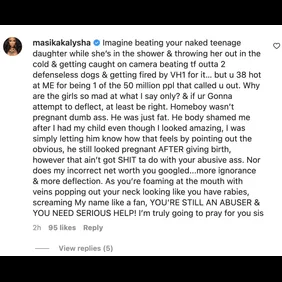 "Imagine beating your naked teenage daughter while she’s in the shower & throwing her out in the cold & getting caught on camera beating tf outta 2 defenseless dogs & getting fired by VH1 for it… but u 38 hot at ME for being 1 of the 50 million ppl that called u out. Why are the girls so mad at what I say only? & if ur Gonna attempt to deflect, at least be right. Homeboy wasn’t pregnant dumb ass. He was just fat."