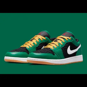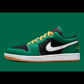 As you can see in the images down below, this shoe features a black base with some geometric patterns on it. From there, we are met with green leather overlays and a snow-white Nike swoosh. Lastly, the laces here are yellow which helps bring the entire look of the sneaker together into a nice little package.