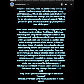 "Why feel the need, after 13 years of my career, say you're 'brainstorming' with six people to my early records... which are miles beyond whatever flaccid and insincere attempt you just made to try for an attention grab during pride month?" Banks wrote. "When you don't give a damn about the gays any other time of the year?"