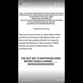 Now, Banks is going scorched earth on Beyoncé in a series of Instagram stories. Down below, you can see that Banks referenced a recent article in which it was revealed that Beyoncé was listening to Azealia while brainstorming for her latest track. Beyoncé also listed a plethora of influences such as David Asante, Mista Jam, and MNEK. Banks did not take too kindly to this as she feels like Beyoncé isn't educated enough about the genre. A perfect example of this is how the "Break My Soul" singer didn't even mention Donna Summer in her list of influences.