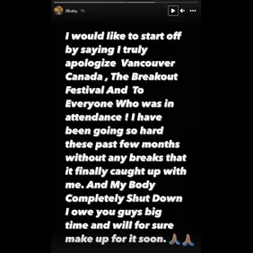 Lil Baby apologized to fans in Vancouver Canada on Monday after bailing on a performance at Breakout Festival over the weekend, which sparked a riot among the crowd. Baby says that all the work he's been putting in other the last several months finally caught up with him and his body "completely shut down."