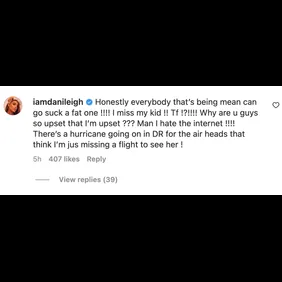 "Honestly everybody that’s being mean can go suck a fat one !!!!" she said. "I miss my kid !! Tf !?!!!! Why are u guys so upset that I’m upset ??? Man I hate the internet !!!! There’s a hurricane going on in DR for the air heads that think I’m jus missing a flight to see her !"