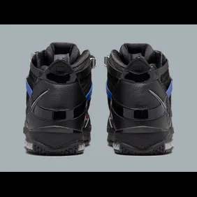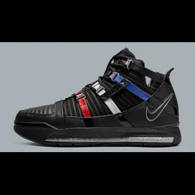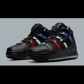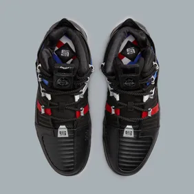 In the images below, you can find the Nike Zoom LeBron 3 "The Shop" which features a black upper with red and blue stripes. On the medial side of the sneaker, we can see a reference to his kids as BBZ is written in black lettering. Of course, this stands for Bronny, Bryce, and Zhuri. Overall, it is a very clean colorway that will definitely appeal to fans of the show.