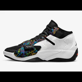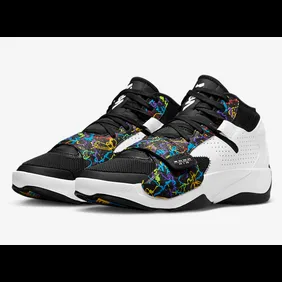 As you can see in the official images down below, the next colorway of the Jordan Zion 2 will be "multi-color." The base of the sneaker is white and the toe box all the way up to the tongue is black. The multi-color elements are placed on the toe strap and overlays in the form of scribbles. These scribbles are blue, green, purple, and even yellow.