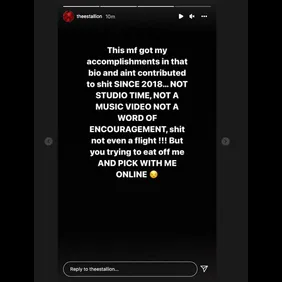 Megan then went on to share more of her thoughts on the matter on her Instagram story, saying, "Mfs pick with me all day then when i say something im the problem F*CK ALL YALL. This mf got my accomplishments in that bio and ain't contributed to sh*t SINCE 2018... NOT STUDIO TIME, NOT A MUSIC VIDEO NOT A WORD OF ENCOURAGEMENT, sh*t not even a flight!!! But you trying to eat off me AND PICK WITH ME ONLINE."