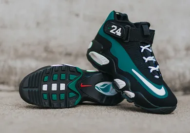 This particular colorway is called “Emerald,” and last released in 2011, around the time Ken Griffey Jr. returned to the Seattle Mariners. This shoe sports traditional Mariners colors, and is clearly built for the baseball diamond with a sturdy construction and high ankle strap. The strap features The Kid’s number 24, and has a vertical swoosh on the back.