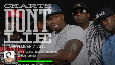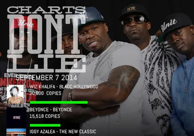 We're currently awaiting first week sale numbers for Jeezy's new album, Seen It All, which is supposed to move around 90k-100k. Even though these are just projections at the moment, it's extremely unlikely The Snowman will be able to beat the sales of his last album TM:103 Hustlerz Ambition, which moved 233,000 copies when it dropped three years ago. We'll wait to analyze those numbers once Seen It All hits the charts though. For now, we've got Wiz's new album Blacc Hollywood dropping five spots in week two of charting. That's not a very steep drop, but it will be interesting to see how the LP does in the long run, as the reviews haven't been the warmest. In other interesting chart news, Beyonce's self-titled album has skyrocketed back up the charts the past two weeks, finding a spot at #14. It's quite the leap from last week's #44. What do we have to blame for this rise in sales? Perhaps her recent VMA performance where she received the Video Vanguard Award gave her an extra push. Plus the fact that Blue Ivy was dancing along to her mom's "Flawless" performance probably helped too (amiright?). Finally, G-Unit make a debut with their new EP The Beauty Of Independence charting at #17. Considering it's just a five-track EP that they dropped out of nowhere, 14,472 copies sold is not too shabby. Check out what else went down below.