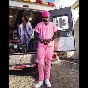 Thugger rocking the "Fuck Cancer"-pink scrubs.