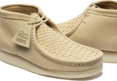 The high top Wallaby boot comes in natural suede, navy blue and an on-trend pink, while the Wallaby lows are only available in the natural tan color. Everything goes on sale online and in Supreme stores tomorrow, May 12.