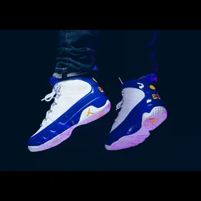 Just like Kobe's pair, this rendition features purple patent leather and yellow accents, though these bad boys feature the #23 on the heel, as opposed to the #8 that was seen on the Black Mamba's PE.